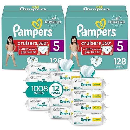 Pampers Pull On Cruisers 360° Fit Disposable Baby Diapers Size 5, 2 Months Supply (2 x 128 Count) with Sensitive Water Based Baby Wipes 12X Multi Pack Pop-Top and Refill (1008 Count)