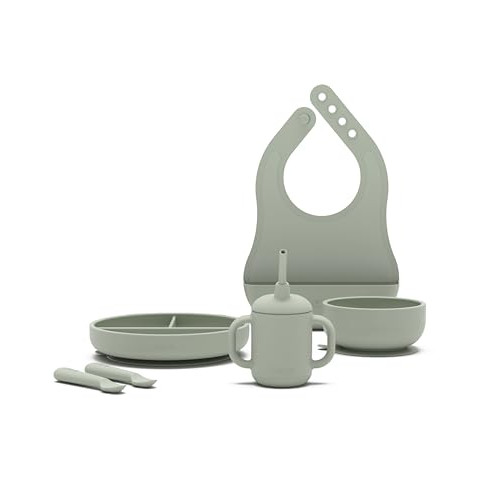 Lalo First Bites Silicone Baby Feeding Set - Baby Led Weaning Supplies - Non-Toxic Silicone - Includes 1 Bib, 2 Spoons, Training Cup, Suction Plate and Bowl - 6 Pieces - Sage