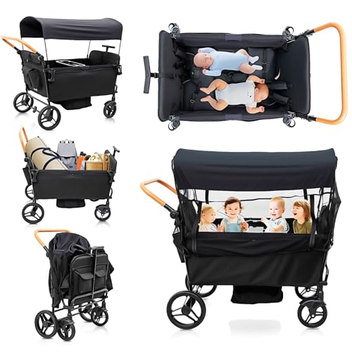 Stroller Wagon for 4 Kids Seated-Tandem Fold Stroller Push-Pull Lightweight Travel Trolley with 5-Point Harness,Adjustable Handle and Canopy,Mosquito Net,Footwells,Child Tray,Cup Holder,Storage