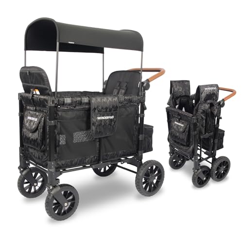 WONDERFOLD W2 Luxe Stroller Wagon (2 Seater) - Collapsible Wagon Stroller with Seats with Magnetic Buckle 5-Point Harnesses and Adjustable Sun Canopy, Elite Black Camo