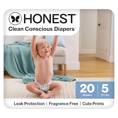 The Honest Company Clean Conscious Diapers for Delicate Skin | Up to 100% Leakproof | Hypoallergenic, Fragrance Free | It's a Pawty | Polybag, Size 5 (27+ lbs), 20 Count